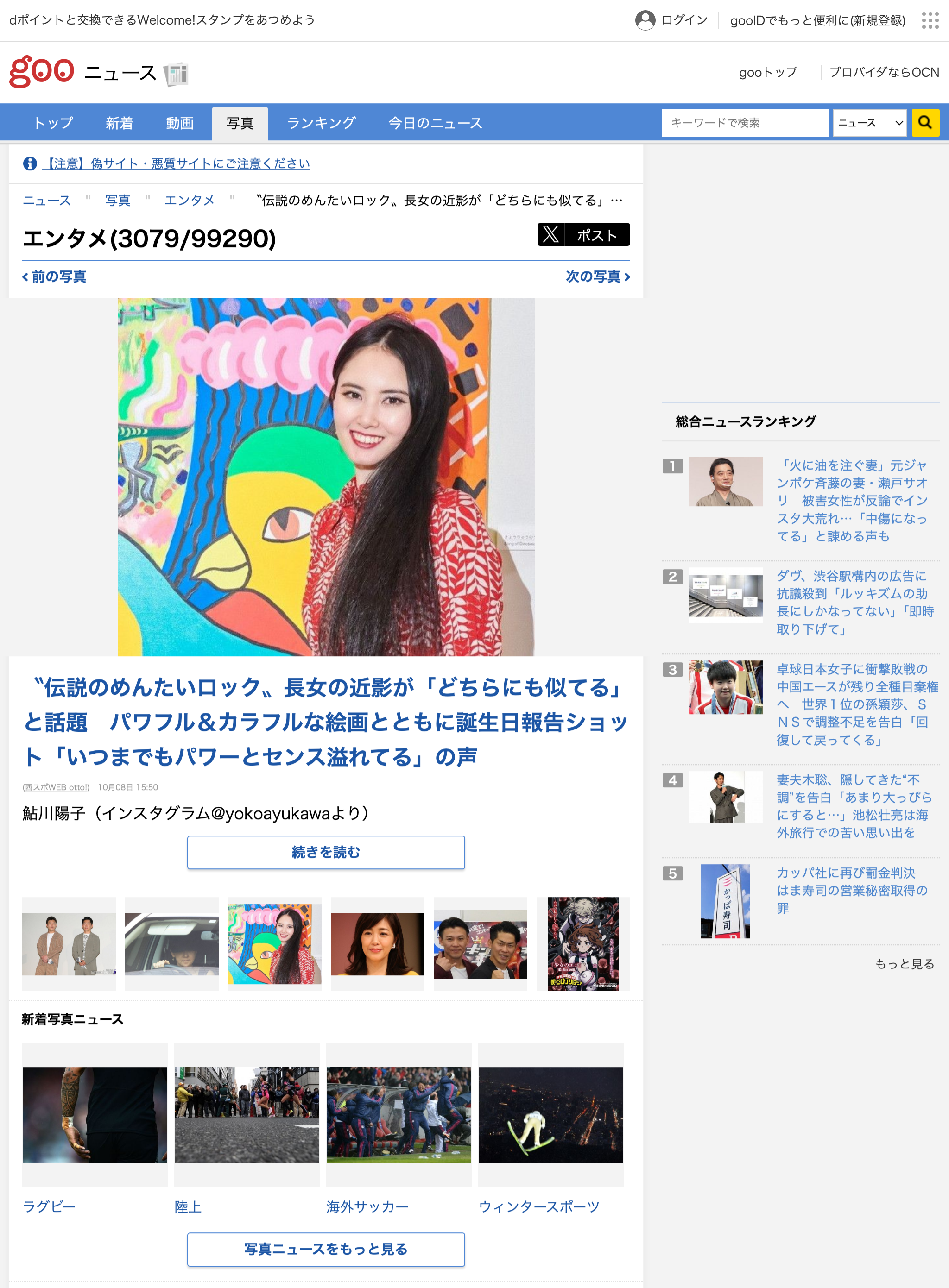この投稿に「ご生誕日、益々のご活躍を祈念しております」「ご両親どちらにも似ていらっしゃいますね」「ヨーコちゃんおめでとう、ってことはじゅんちゃんもおめでとう」「いつまでもパワーとセンス溢れるお二人が素敵です」「陽子さんと純子さんにとって、明るくポジティブな1年になります様に」など、この日ともに誕生日を迎える次女の純子へのお祝いメッセージも寄せられている。鮎川の両親は、福岡が生んだ伝説的ロックバンド、シーナ&ザ・ロケッツのシーナさんと鮎川誠さん。鮎川は双子の長女で、次女の純子と7歳年下の妹、知慧子はロックバンド「DARKSIDE MIRRORS」を結成している(現在は活動休止中)。知慧子はシーナ&ザ・ロケッツの2代目ボーカリストとしての活動も行っている。